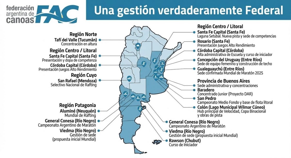 ¿Qué logramos juntos este año? ✅ Saneamiento Institucional: Saldamos la totalidad de la deuda histórica con la ICF y regularizamos nuestra situación ante la IGJ. ✅ Infraestructura Propia: Capitalizamos a la federación con la compra de un Truck de transporte, motores, tecnología de comunicación y fiscalización. ✅ Argentina al Mundo: Logramos la sede del Mundial de Maratón 2026 (Gualeguaychú) y ejecutamos con éxito el Mundial de Rafting en Aluminé. ✅ Sustentabilidad: Somos pioneros en premiaciones sustentables y cuidado del medio ambiente. ✅ Futuro: Consolidamos el recambio generacional con el proyecto Junior y nuevas escuelas de canotaje.
